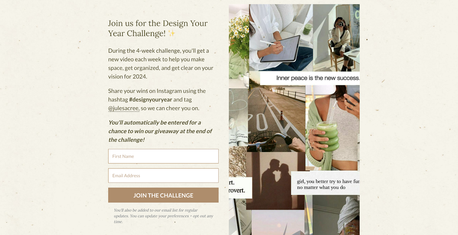 The “Design Your Year” Notion pack sells on her website for just $33, making this an affordable and fun challenge to take part in. Consider if your digital product can be configured into a challenge as well, making it more fun and motivating for people to purchase and participate.