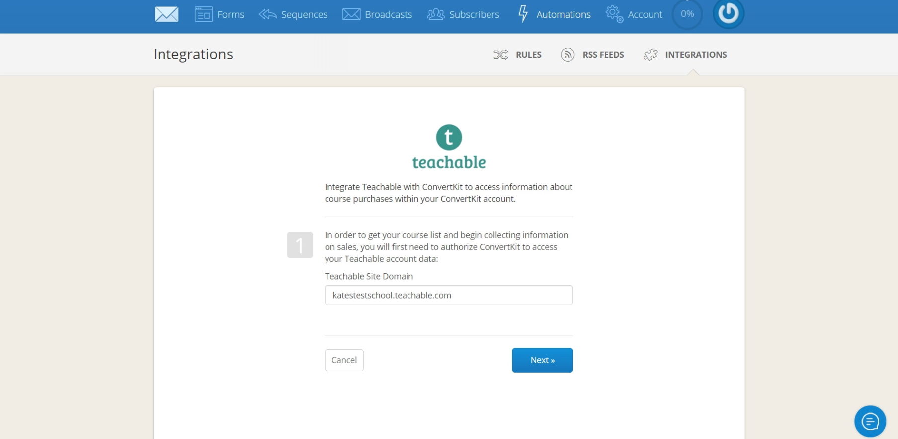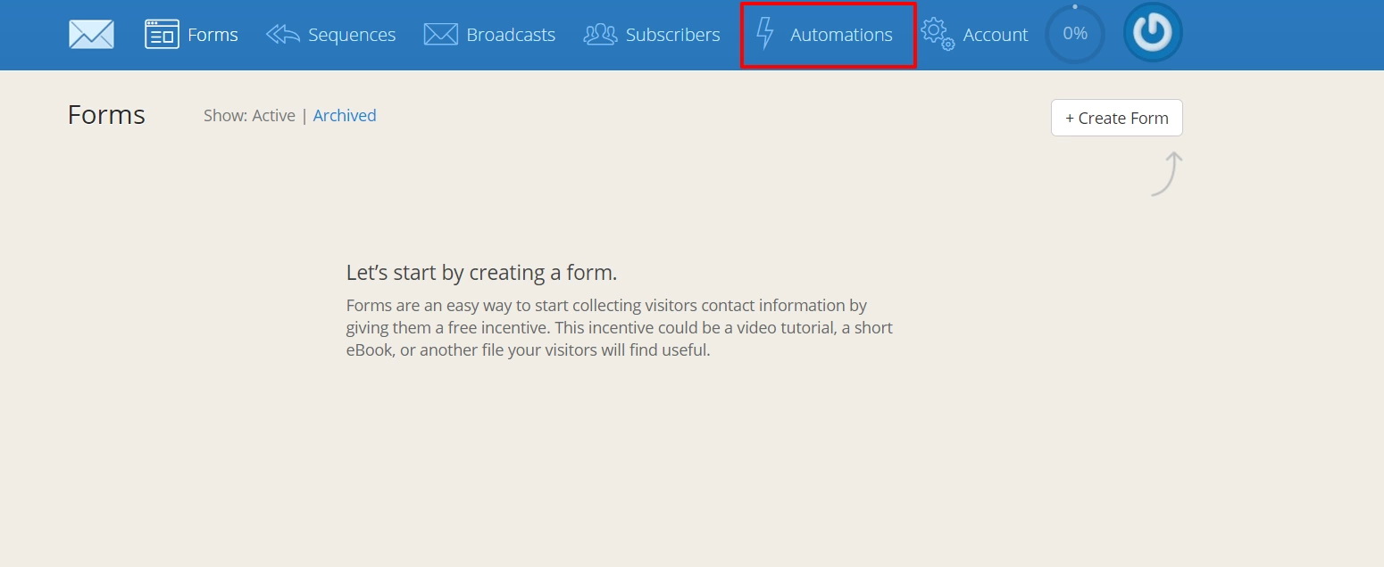 1. First, we’ll need to connect your Teachable and ConvertKit accounts. Log into ConvertKit and click Automations in the top bar.