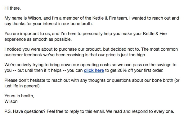 Let’s continue reviewing interesting abandoned-cart emails. Now it’s Kettle and Fire’s turn on the hot seat.