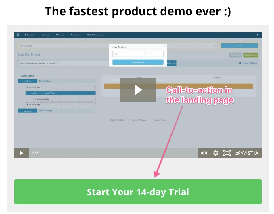 - Solution: Immediately after that, Carthook provided a solution to address the user’s concern. In this case, because it’s a software product, a demo was provided. If you want to do something similar, consider whether or not the addition of a different call-to-action will distract your user from the email’s primary objective. The company solved this problem by placing the main call-to-action in the landing page containing the demo video: