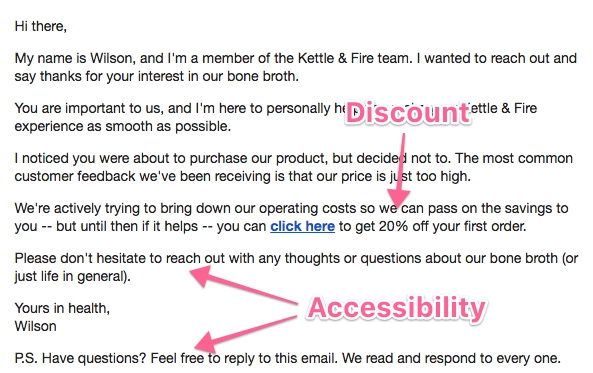 - Kettle and Fire’s cart-abandonment email includes a coupon code. This is a great tactic if you sell a product that you expect the user to purchase again once they’ve tried it, or if your product has a premium price. However, this is the obvious downside to coupons: reduced dollar value of the purchase. If you decide to use this tactic for one-time-purchase products, I recommend that you offer the coupon in the last email in a sequence of abandoned-cart emails. This allows some users to purchase at a higher price point before you offer a discount.
