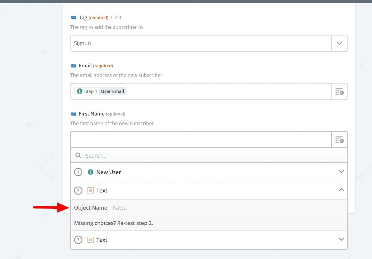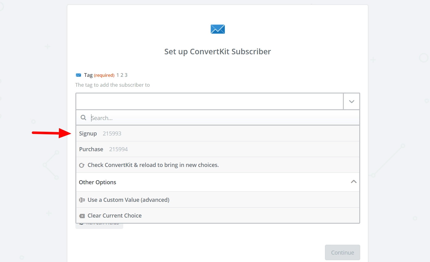 Once the accounts are connected, continue setting up your action. First, select Signup as the tag from the first dropdown menu.