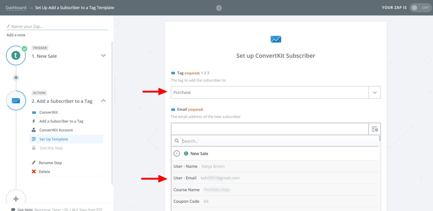 9. Again, your main action will be to Add a Subscriber to a Tag, using ConvertKit as the action app. Set up the template so the tag is Purchase and the email is the User Email from step 1.