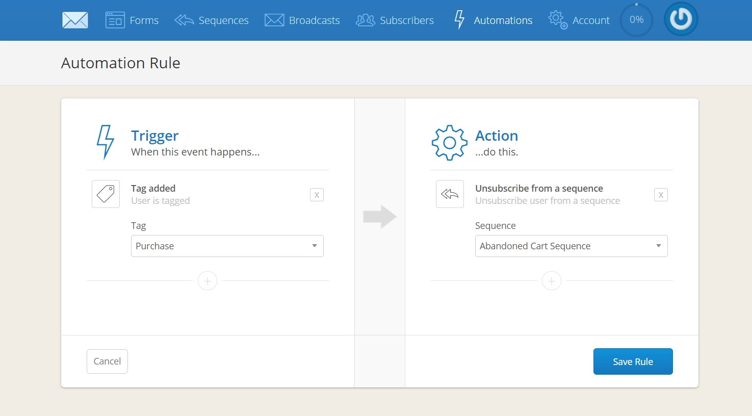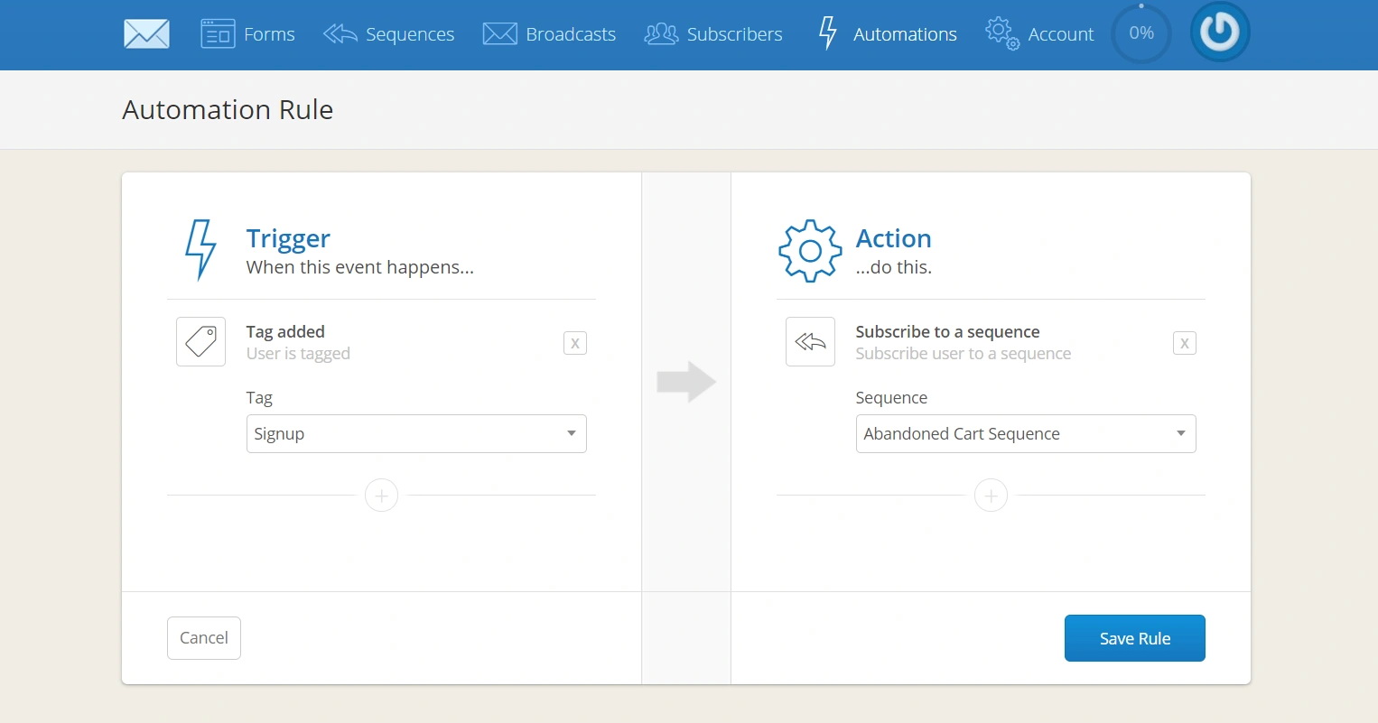 Automations work similarly to Zaps, with a trigger and an action. For your first automation, select Tag Added (Signup) as the trigger, and Subscribe to a Sequence (Abandoned Cart Sequence) as the action. Click Save Rule when done.