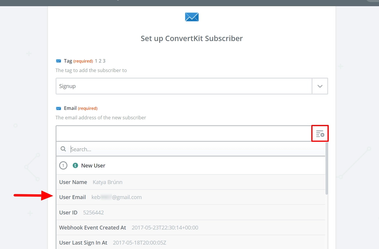 In the Email field, click the box to the left and select the User Email from your New User step.