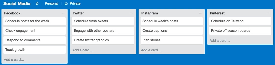 Another great organizational program is Trello. Trello is very similar to Asana but a bit more visual for those people who store information better that way. It’s not necessary by any means to have both Asana and Trello, it just depends on how you visualize things.