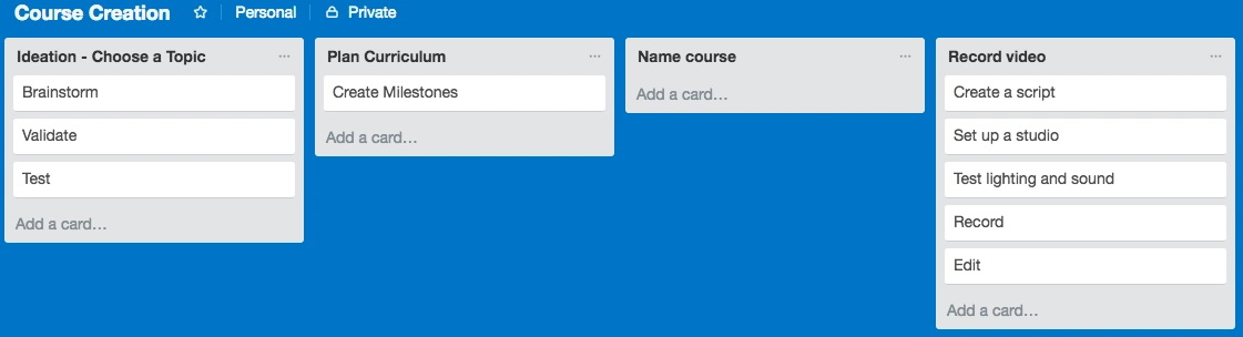 Use Trello to set up every step of your course creation process. We all have slightly different systems when it comes to creating our courses, but your board might look something like this: