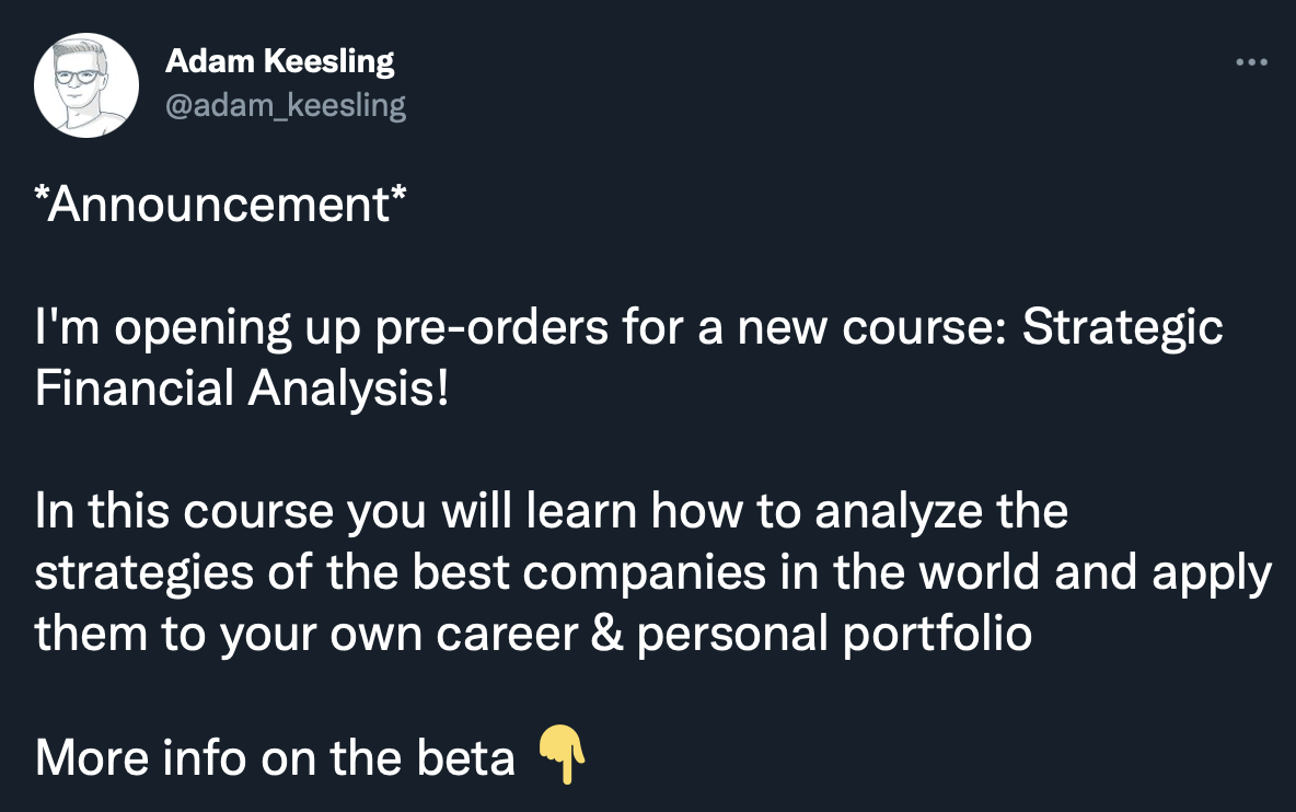 Entrepreneur Adam Keesling did just that with the first cohort-based course he decided to launch. On his Twitter, he shared the tweet that announced his upcoming CBC before he even started working on it: