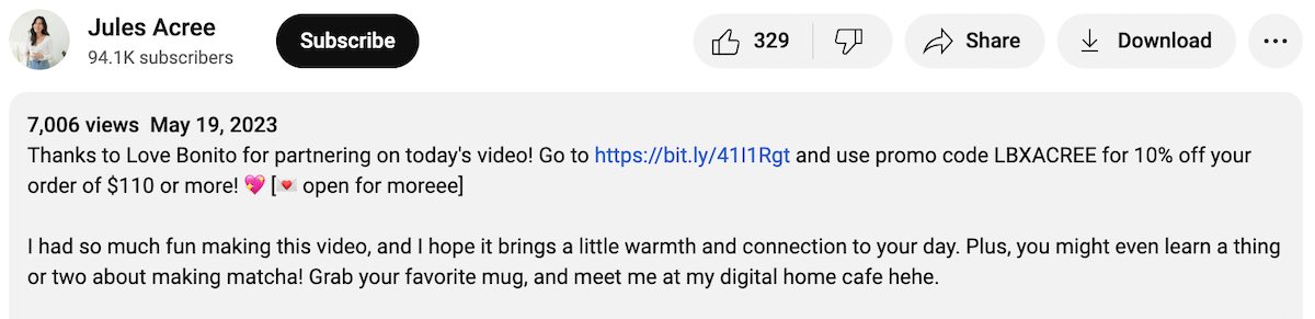 For example, YouTuber Jules Acree includes a few sentences in video descriptions for paid partnerships. It includes her affiliate link and a promo code.