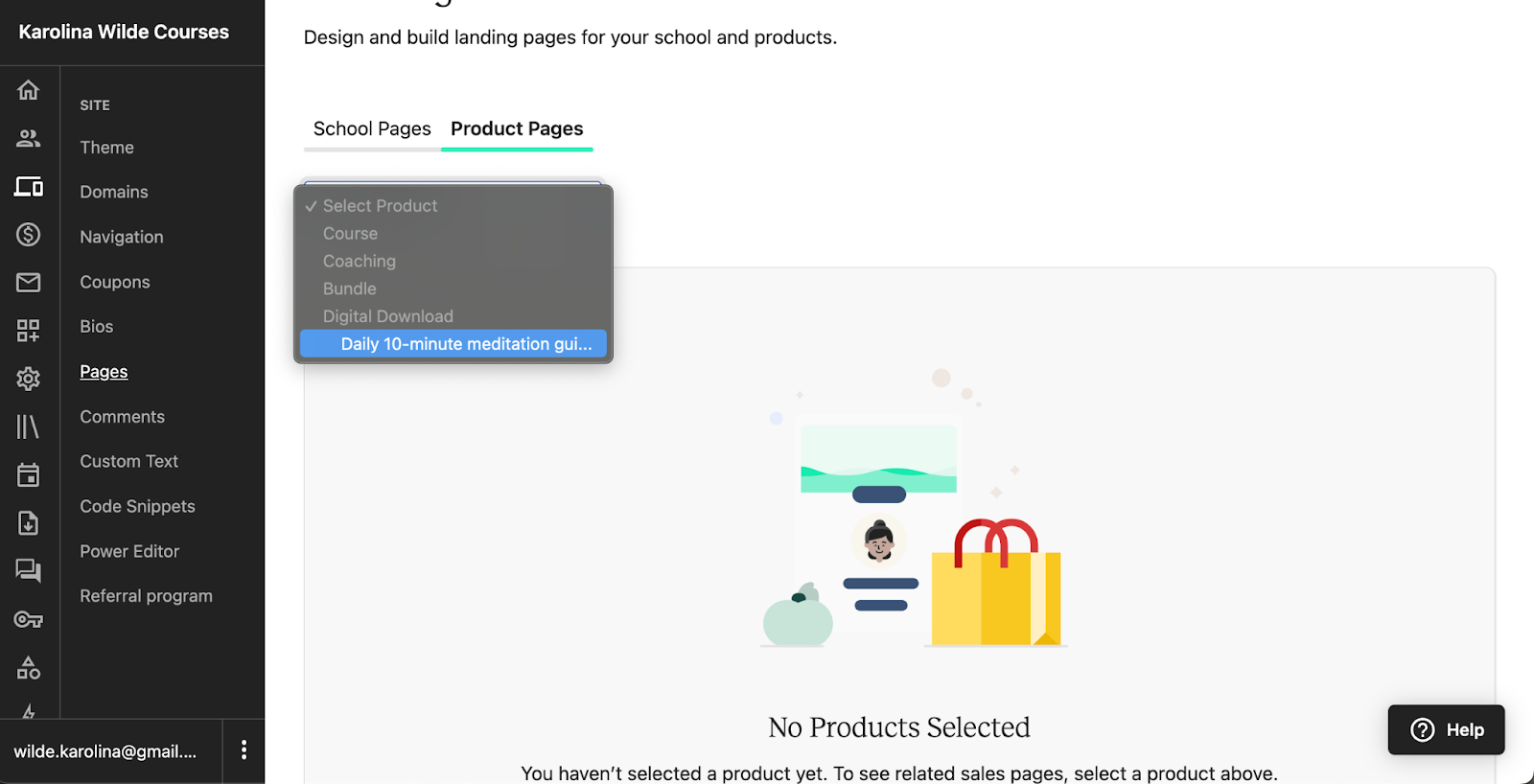 Teachable allows you to build separate pages to sell your online courses and other digital products through the platform. In your dashboard, go to "Site" and "Pages," where from a drop-down menu, select the product for which you want to create a new website.