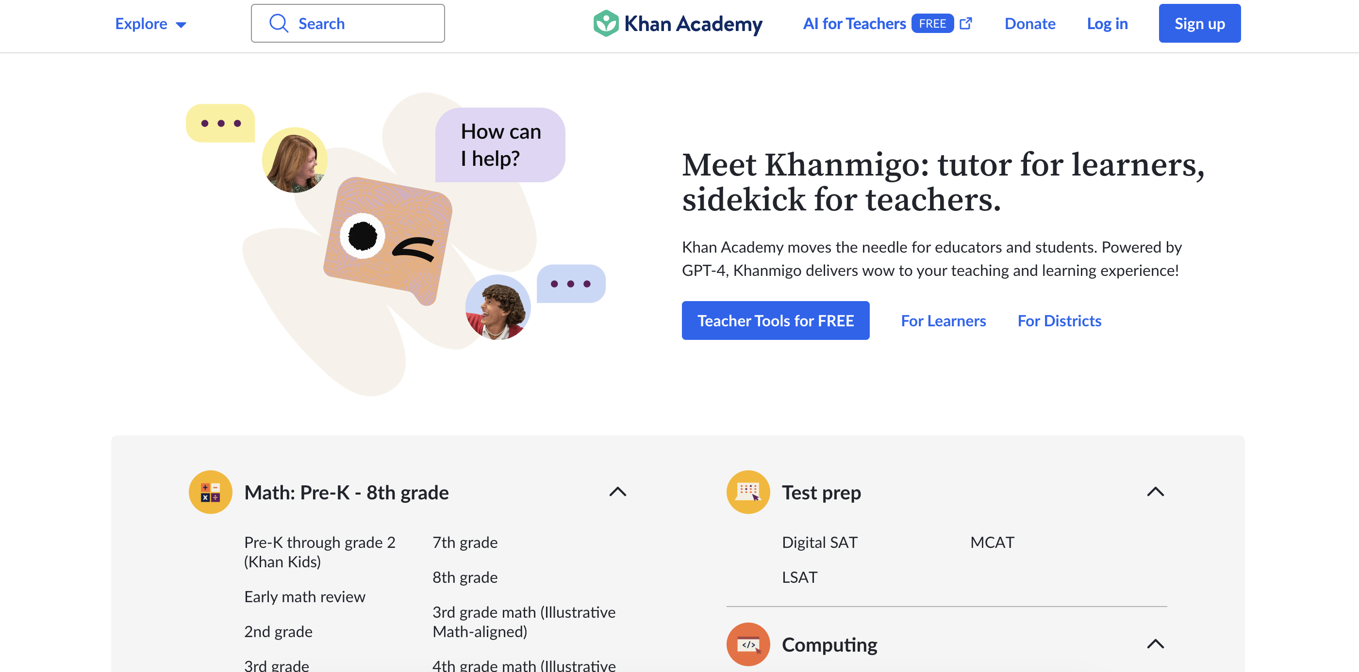 Khan Academy provides high-quality, free educational courses in subjects like math, science, economics, and humanities.