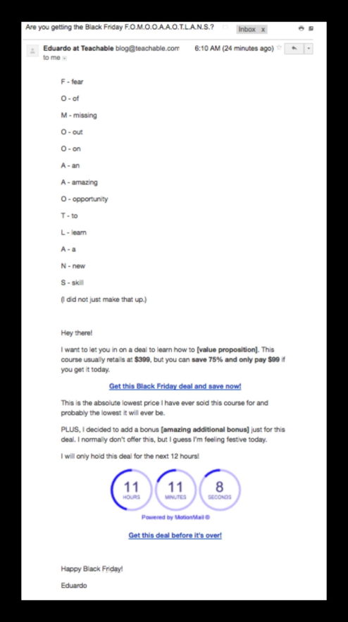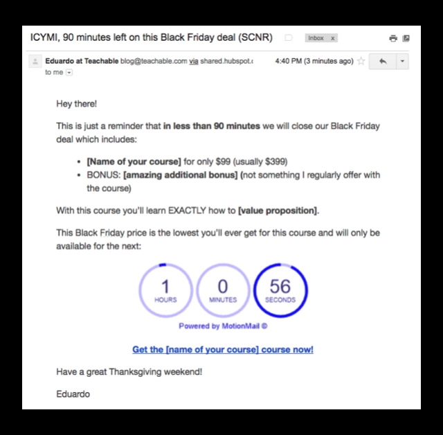 Schedule the first email to go out on Friday at 6-7am. This one is meant to introduce your deal and set the timeframe for its validity. We’ll also include a nifty free countdown timer into it.