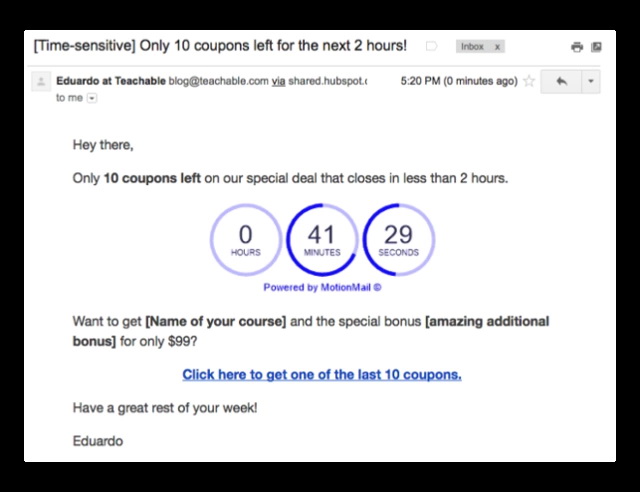 - Go to MotionMail to get your free countdown timer—set it up to end 12-14 hours after the email is sent