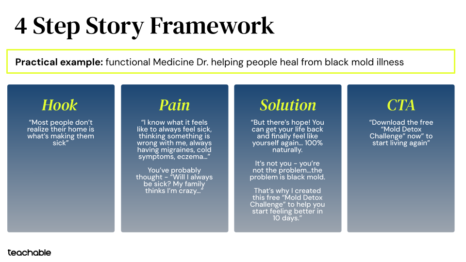 This format works on sales pages, social posts, emails, live streams, and short videos.