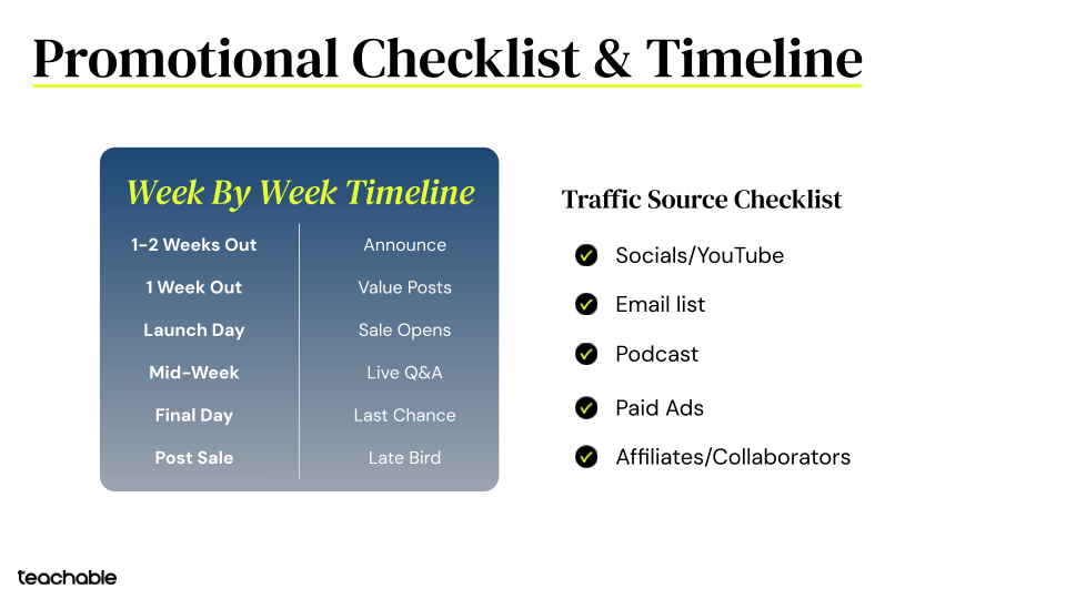 You can widen your reach by promoting your offer across the channels your audience already uses. The webinar included a straightforward checklist that covers every major traffic source.