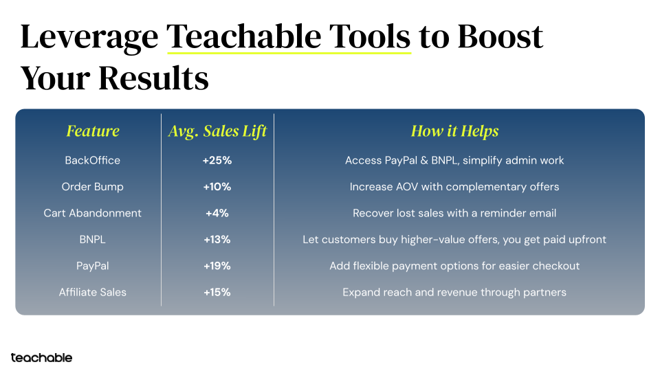 You can strengthen your sales performance with the tools already built inside your Teachable account.