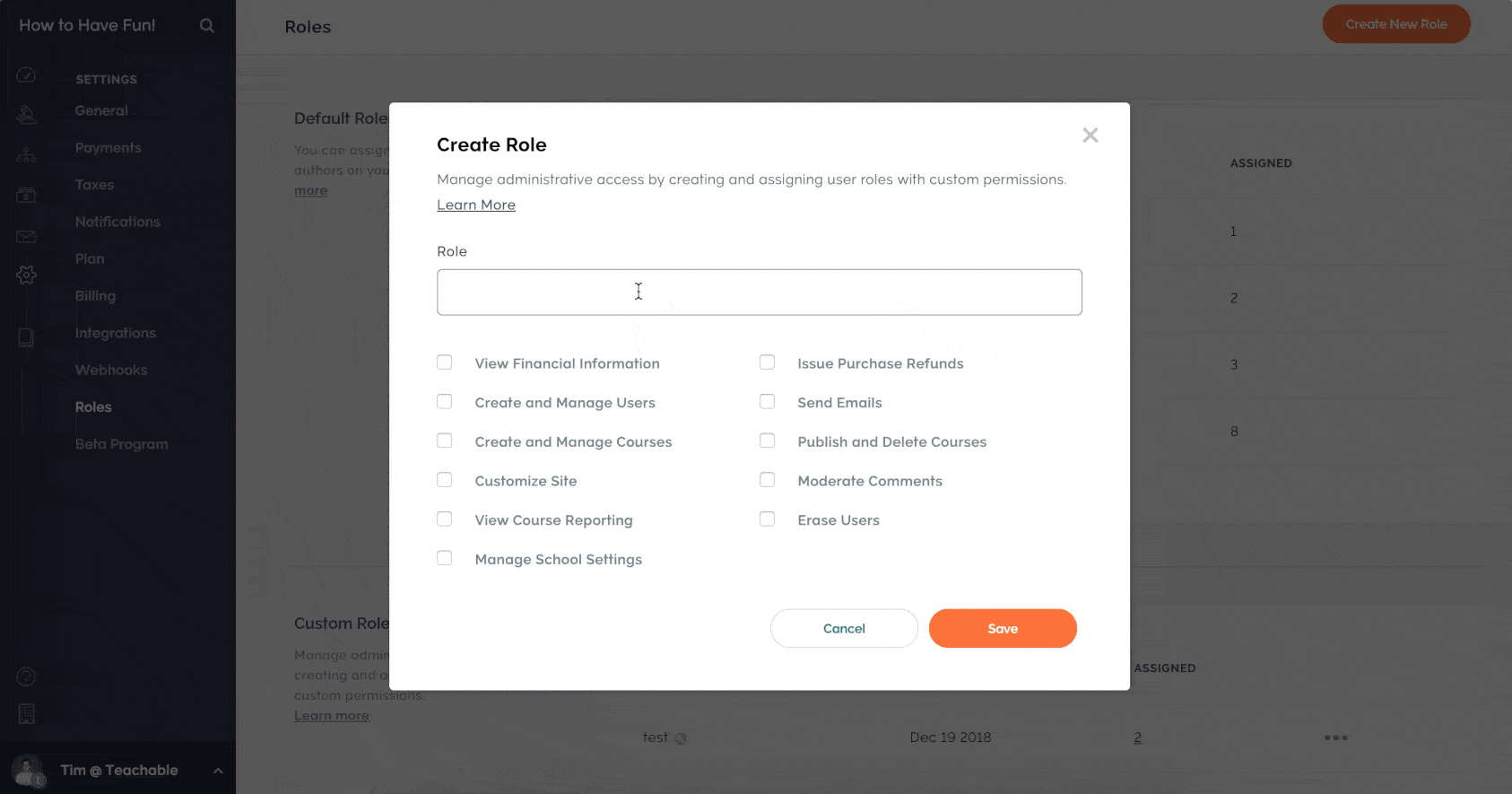 Workarounds have always made it possible to control user privileges on Teachable to a certain degree. But, we’re so excited to share that Teachable now offers the ability to create custom user roles. With custom user roles, you as the primary owner of a school can create unique user types with permissions that you define. You can assign multiple people to the same custom role, or even make unique roles with specialized permissions for each member of your team.