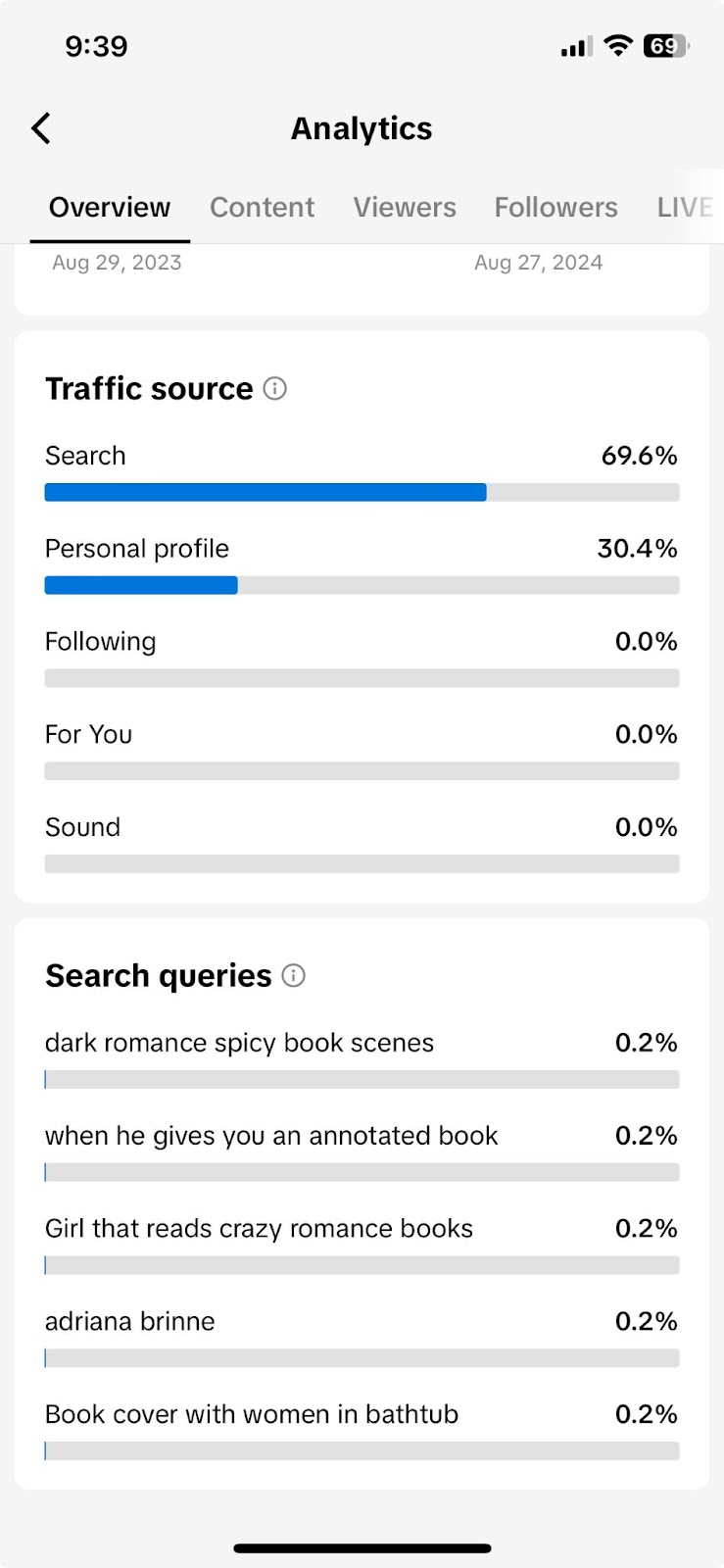 When you first open your TikTok Analytics, you'll see the Overview section. Here, you can see a few key metrics right off the bat. While it's good to see these things, the most important information you'll find if you scroll down to the "Traffic Source" and "Search Queries" sections.