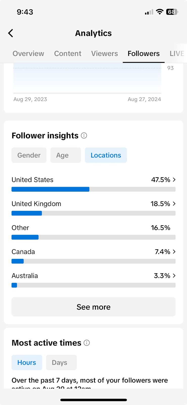 In the "Viewers" section, you can see lots of key metrics about people who view your content, such as their age, location, and total views. However, the most important metric to track here is the "Most active times."