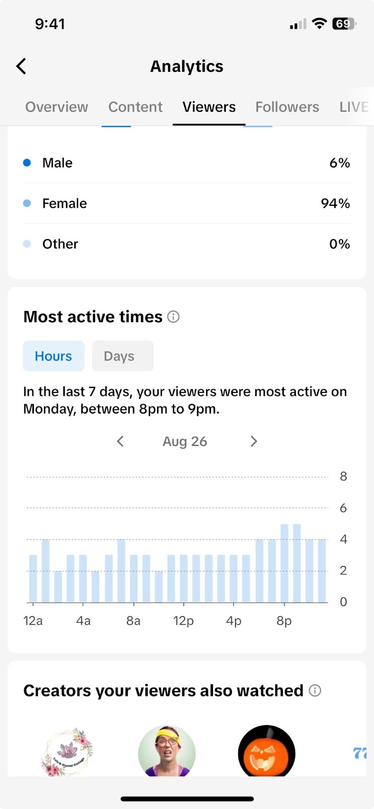 TikTok shows you what times of day, and which days of the week your viewers were the most active and engaged with your content. This is such a useful information to know because it allows you to better schedule your posts and know exactly when to post during the week and day to reach the most amount of people.