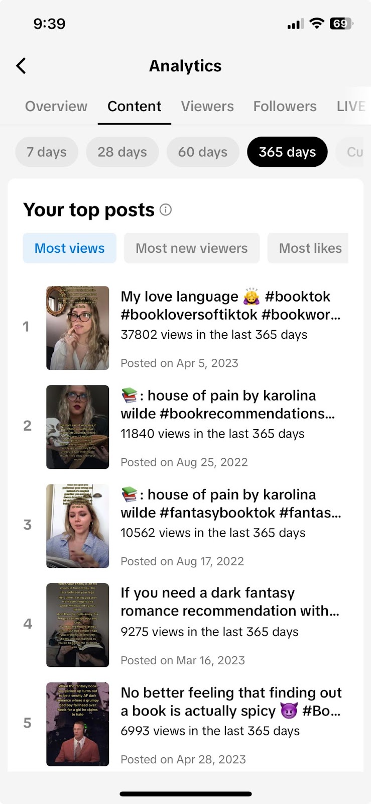 In the "Content" section, you are able to see your top-performing posts by views or likes.