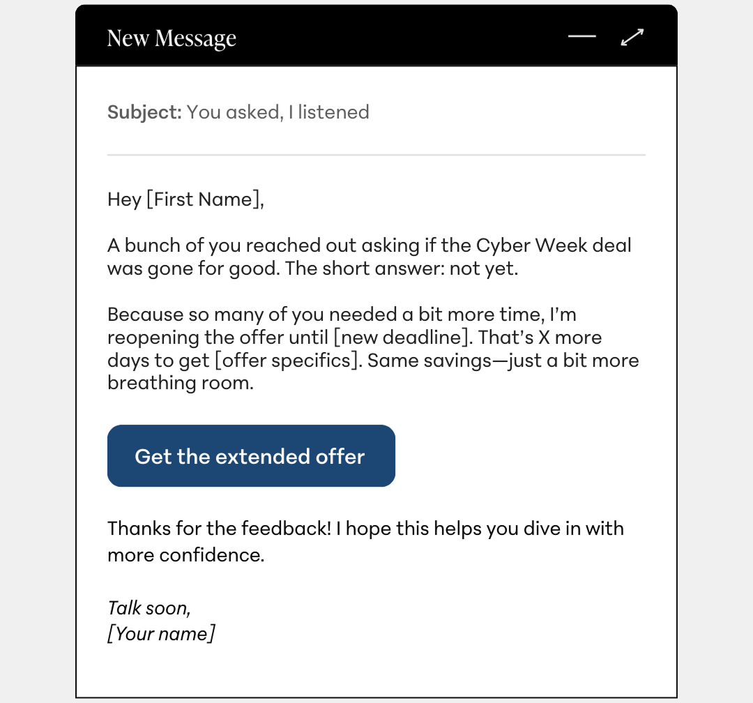 Pro tip: Hyper-personalization works great here—mention real questions that came in, delays your audience faced, or specific reasons people asked for more time. It makes the extension feel earned, not manufactured.