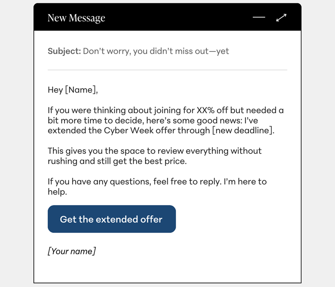 Pro tip: This approach shines when sent fast—think right after the original sale closes—to the right people. If you delay the extension too long, the simplicity reads flat. By sending it to a segmented group of people who have already opened your previous emails, you can be sure that they already have a clear understanding of the benefits of your offer.