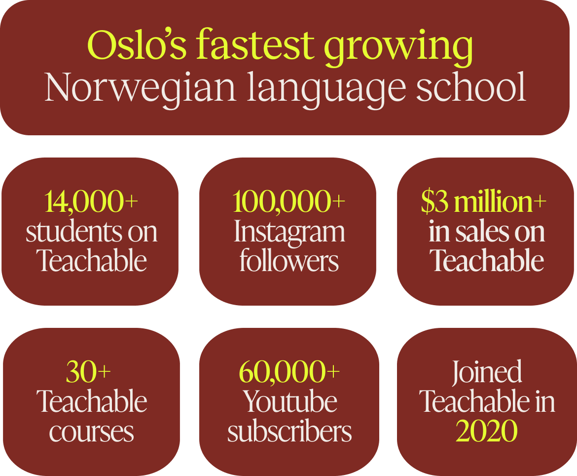 They chose Teachable because it let them focus on what they did best: creating engaging, conversation-focused Norwegian lessons. The platform's user-friendly interface meant their teachers could create and manage courses without needing technical expertise.