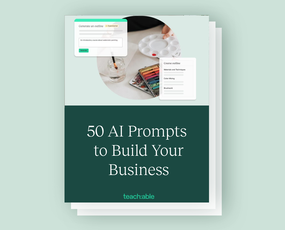 Unlock your creative potential with Teachable's comprehensive AI Resources Bundle! Featuring 50 AI prompts and powerful tools to streamline your workflow, this bundle empowers you to efficiently tackle tasks, boost your productivity, and focus on what truly matters in your business.